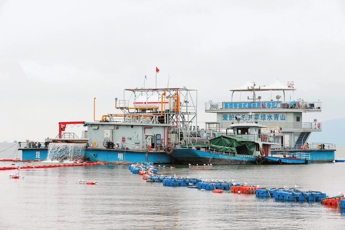 近年來(lái),昆明市強化科技治理,做好滇池藍藻防控工作。截至今年8月底,累計收集處理富藻水2702.64萬(wàn)立方米,處置藻泥12092噸,尾水原位回補滇池1618.45萬(wàn)立方米。隨著(zhù)滇池治理工作的不斷深入,滇池全湖水質(zhì)持續向好,連續5年保持Ⅳ類(lèi)。圖為昆明滇池東碼頭附近水域實(shí)施撈藻、沖藻作業(yè)。